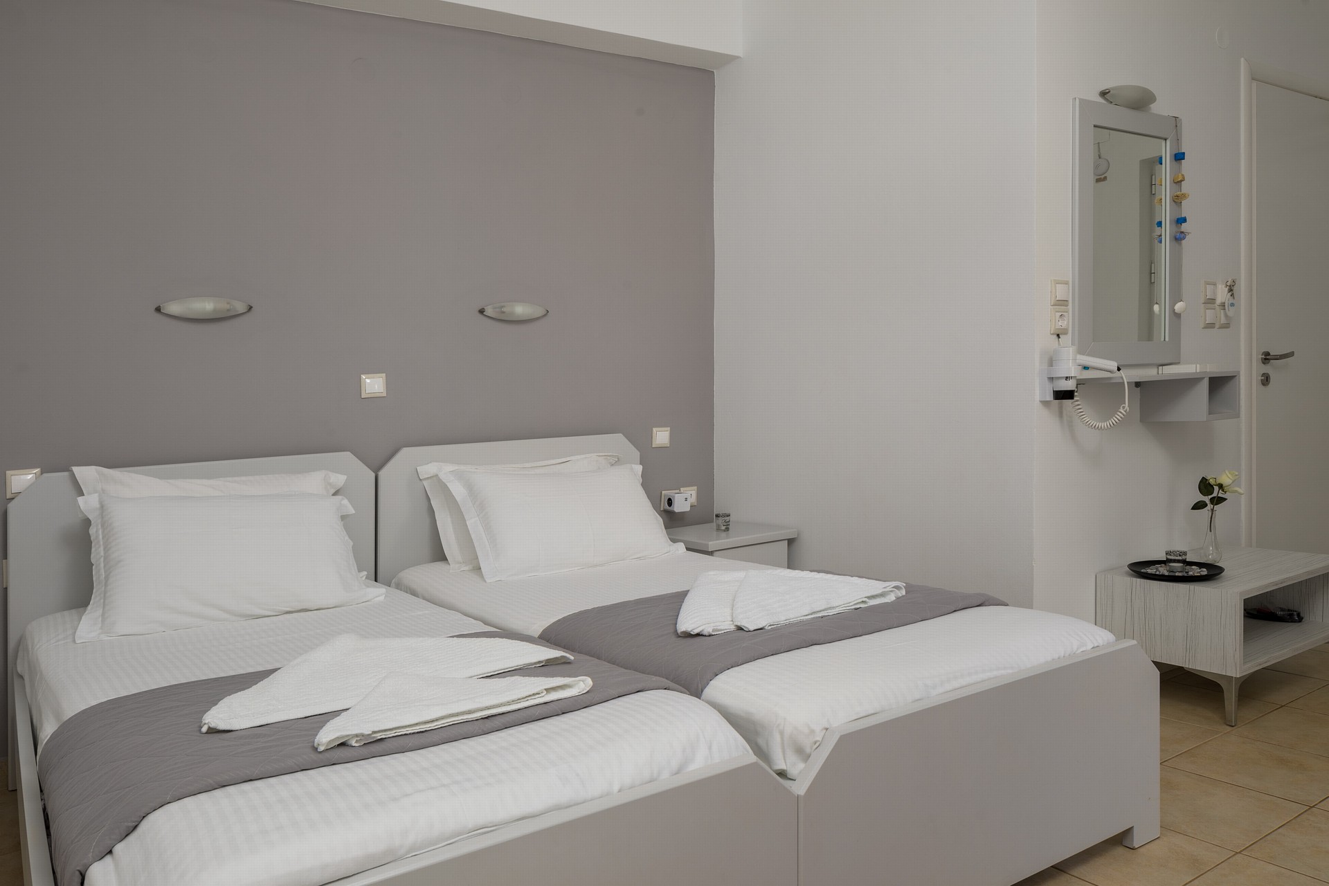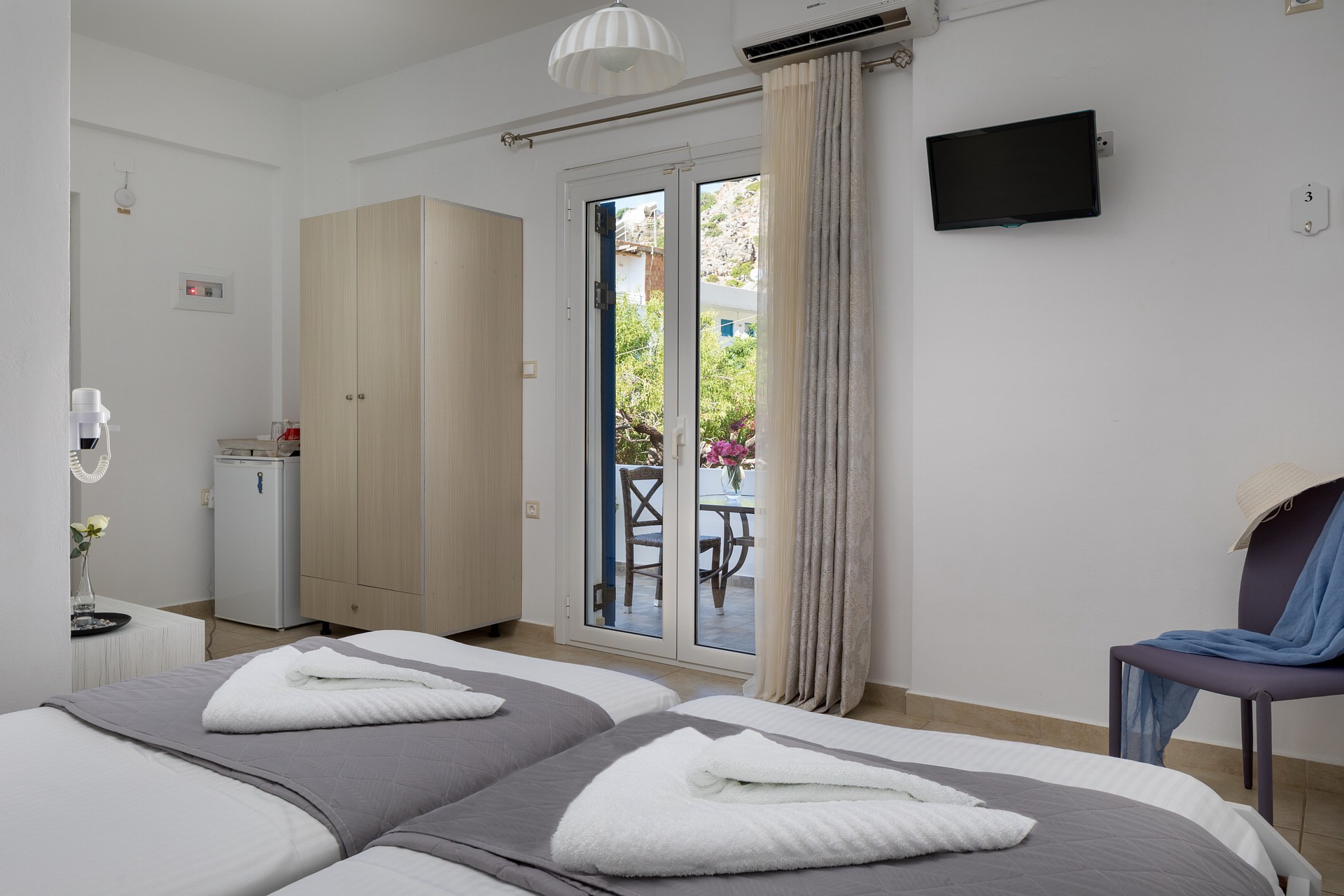 Decorated in bright pastel colors, the elegant John Akroyiali Double Rooms are equipped with two comfortable single beds that are joined together for maximum comfort, one single bed for an extra person, a modern bathroom and a range of luxurious amenities to make you feel like home. On the outside private furnished terrace, the guests enjoy their carefree vacation in the enchanting Loutro of Sfakia, Chania, Crete.