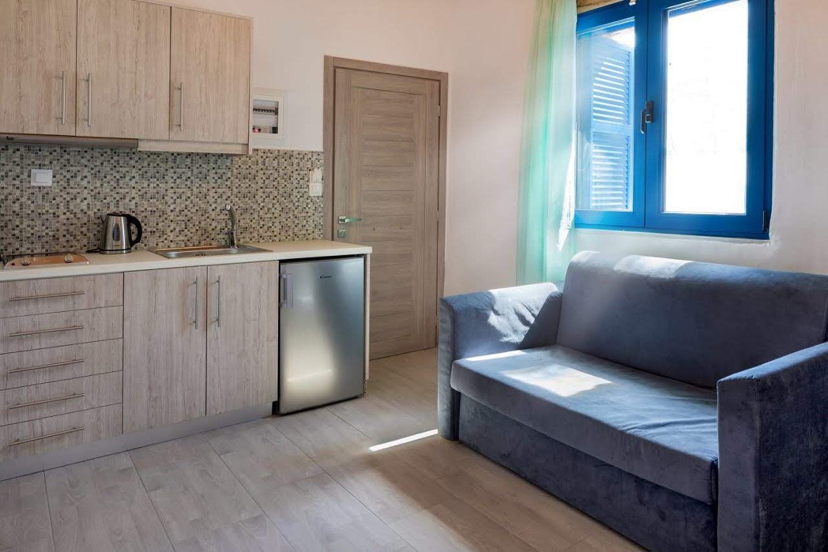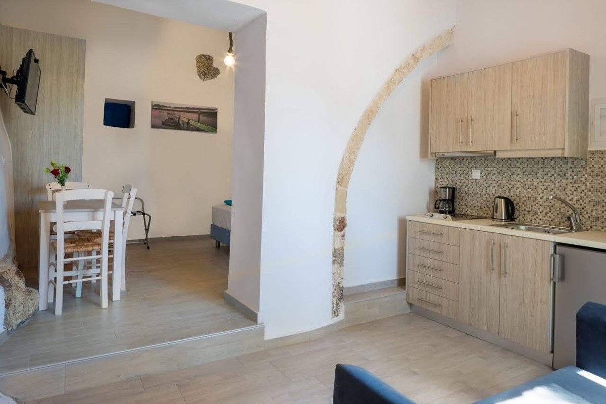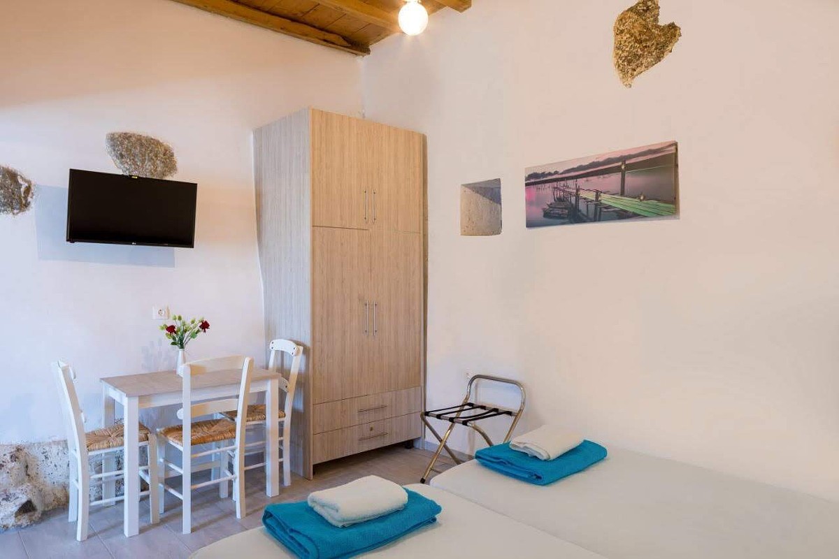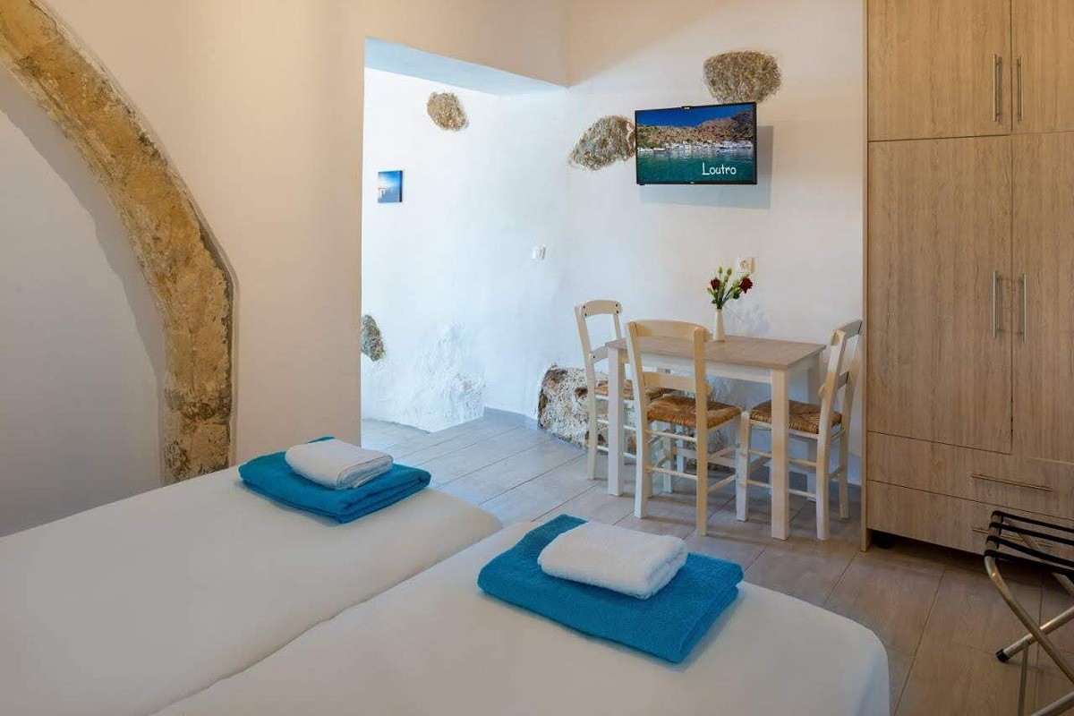 The elegant John Akroyiali Lithos Apartment are equipped with one double bed and one single bed and one armchair that can be converted to a single bed. there is also a modern bathroom and a range of luxurious amenities to make you feel like home. On the outside private furnished terrace, the guests enjoy their carefree vacation in the enchanting Loutro of Sfakia, Chania, Crete.